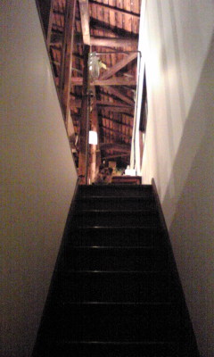 写真はそら庵2階へと続く階段 段上にはポチ子がいます